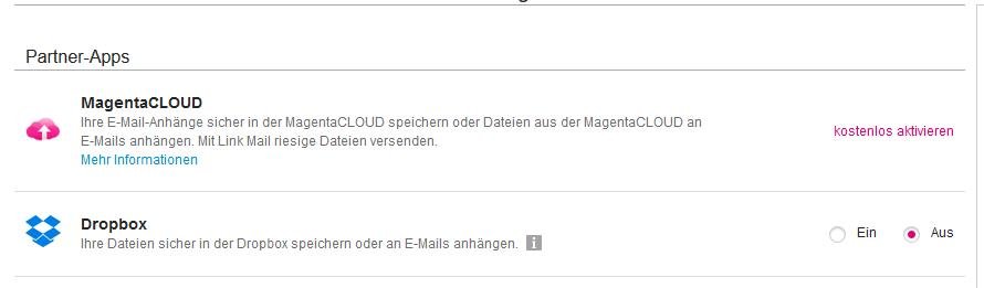 Zusätzlich können sie entweder kostenlos die Magenta Cloud aktivieren um weiteren Speicherplatz zu erhalten, oder sie verknüpfen ihre T-Online eMail mit dem Anbieter Dropbox.
